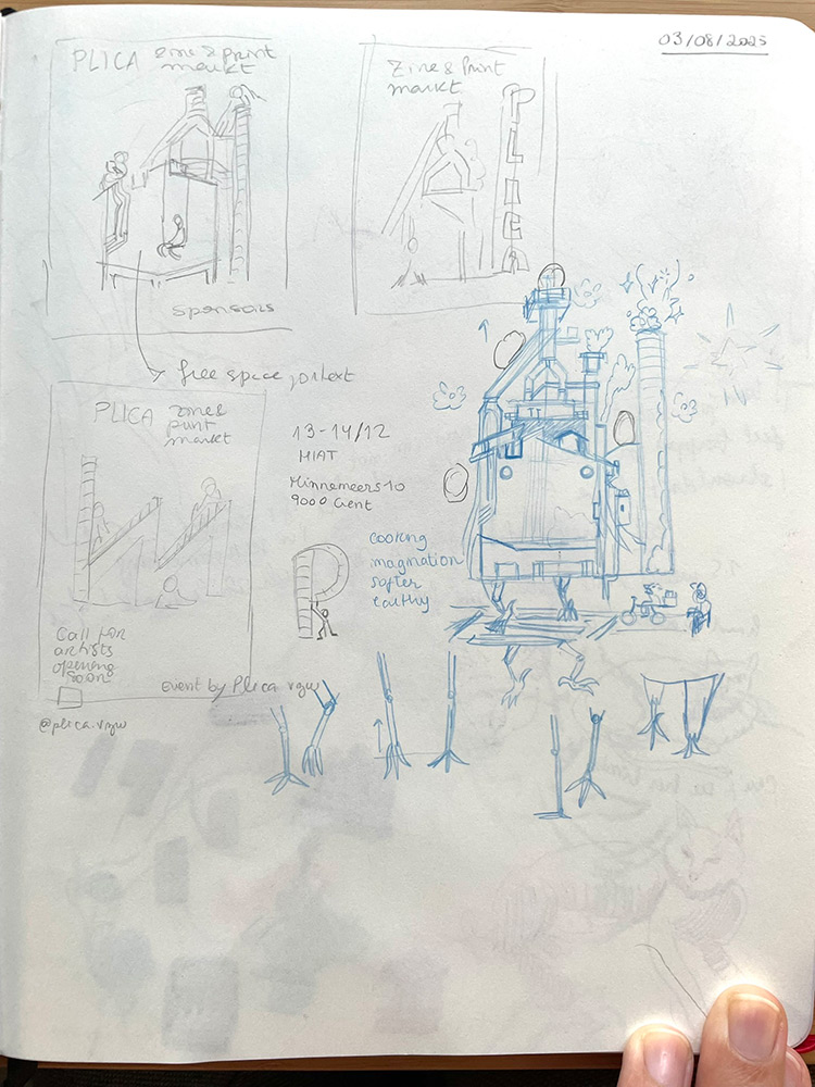 Ik ontwierp de Plica-personages en wilde onze vaste figuren behouden: de Plica-vogel, de bloem, de bug en de paddenstoel. Ik zie ze als kleine beschermers van onze zine-evenementen. Dit jaar wilden we meer detail en beweging toevoegen, waardoor de visuals echt een niveau hoger kwamen. Ik ben superblij met hoe onze samenwerking is uitgepakt.