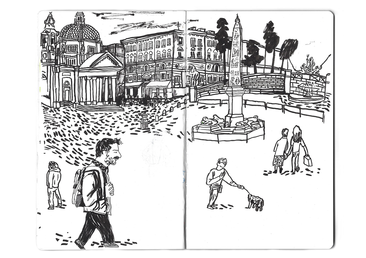 Voor het beeldverhaal baseerde ik me onder meer op de brieven van William Beckford, geschreven tijdens zijn Grand Tour in 1783. In zevenentwintig brieven beschrijft hij niet alleen zijn reiservaringen, maar ook de romantische dagdromen waarin hij voortdurend vervalt. Die historische stem vermeng ik met mijn eigen, vaak moeizame reiservaringen. Ik trok zelf enkele dagen naar Rome om er ter plekke te tekenen en het verhaal verder uit te werken.